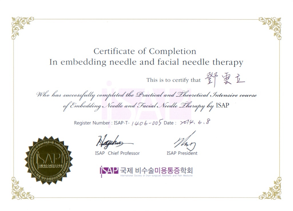 International Society of (non-surgical) Aesthetic and Pain Medicine 韓式整顏針 結訓證書