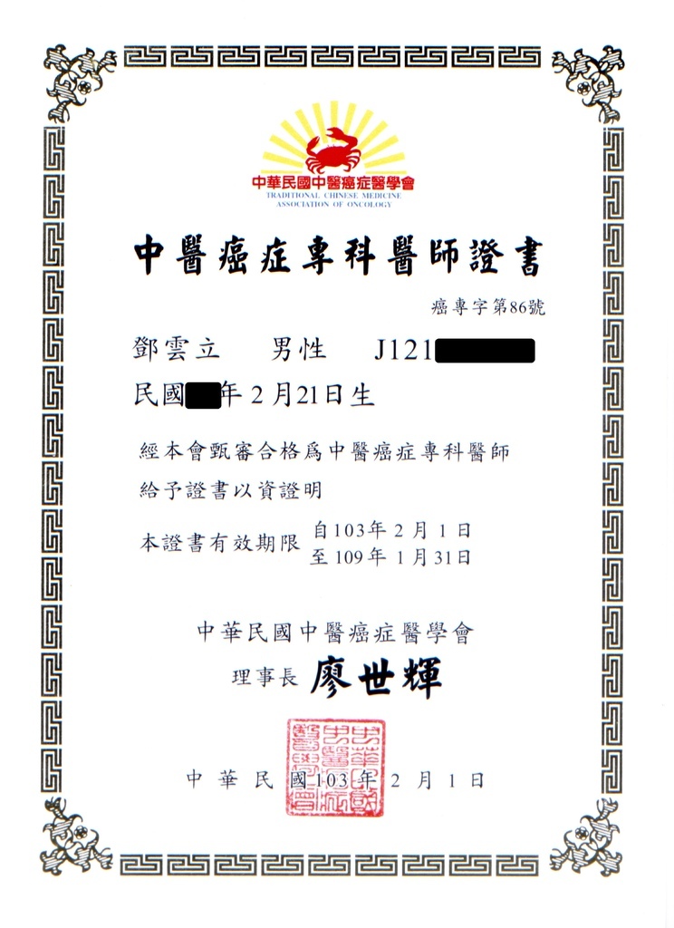 中華民國 中醫癌症專科醫師證書