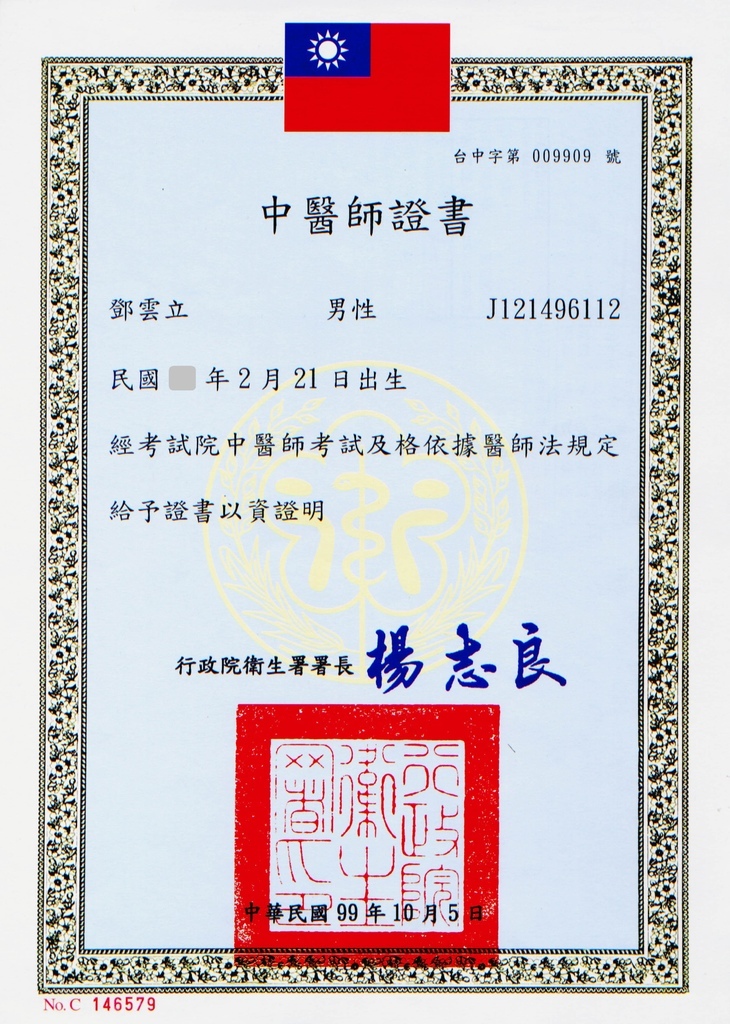 中華民國 中醫師 高考及格、中醫師證書