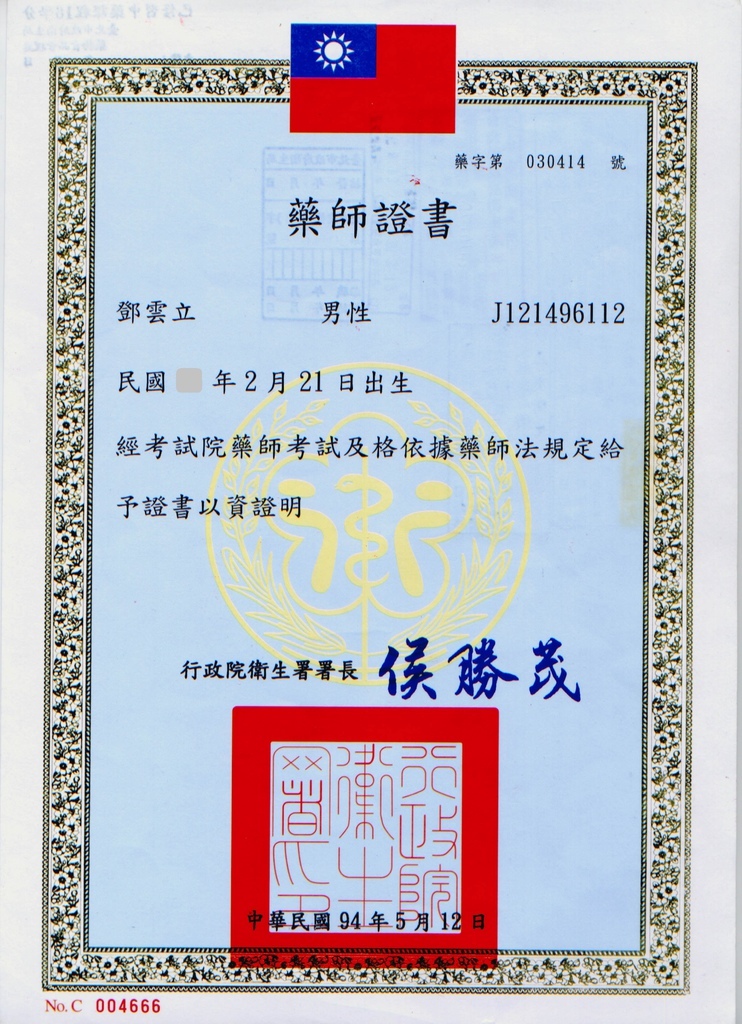 中華民國 藥師 考試及格、藥師證書