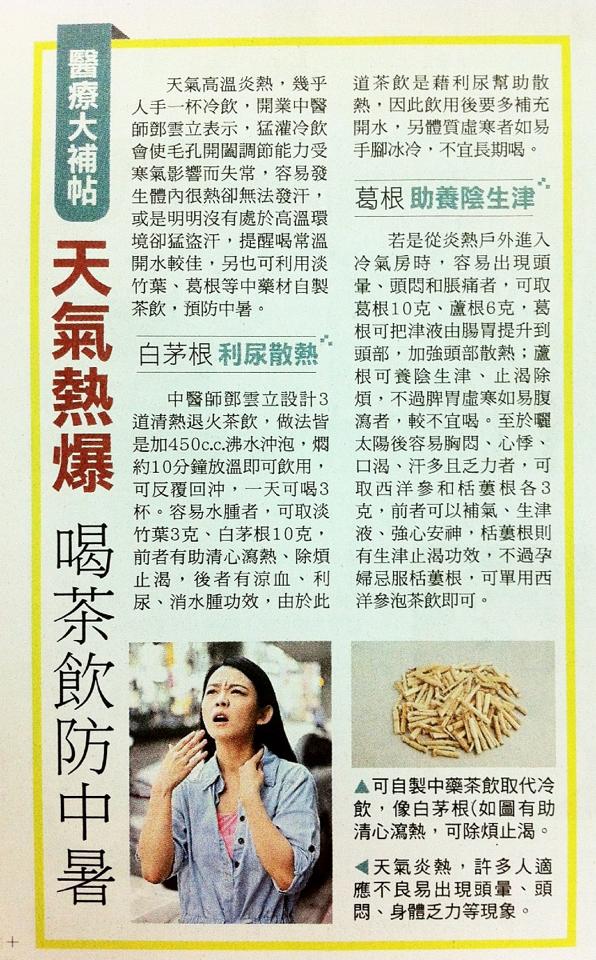 提醒喝常溫開水較佳,另也可利用淡竹葉、葛根等中藥材自製茶飲,預防中暑。