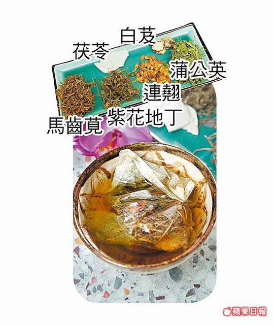 紫花地丁、蒲公英、馬齒莧、連翹可清熱消炎;茯苓利濕消腫;白芨修復痘瘡。