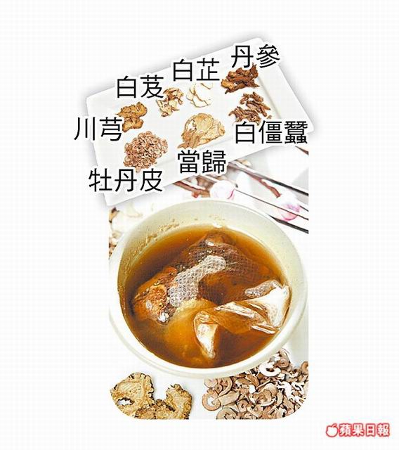 川芎、丹參、牡丹皮皆能活血化瘀、淡斑,當歸活血,白芷、白僵蠶和白芨助美白。